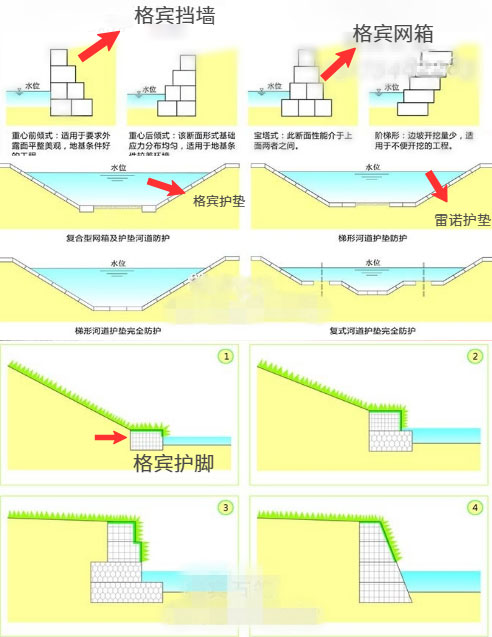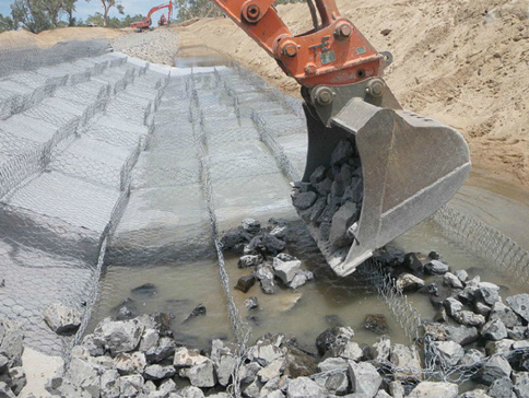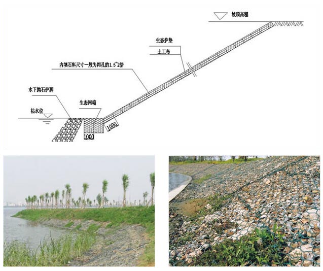 雷諾護(hù)墊是厚度在0.17-0.3m的網(wǎng)箱結(jié)構(gòu),在現(xiàn)場(chǎng)用于裝填石頭。主要用作河道、岸坡、路基邊坡護(hù)坡結(jié)構(gòu)。既可防止河岸遭水流、風(fēng)浪侵襲而破壞,又實(shí)現(xiàn)了水體與坡下土體間的自然對(duì)流交換功能,達(dá)到生態(tài)平衡。坡上植綠可增添景觀、綠化效果。
